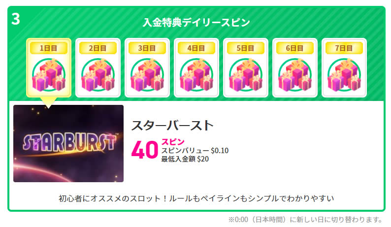 初めて入金するプレイヤー向けのボーナスが15万円と高額な事、さらに毎日、日替わりスロットを無料で回せるデイリースピンが付いてかなりお得なパッケージとなっています。