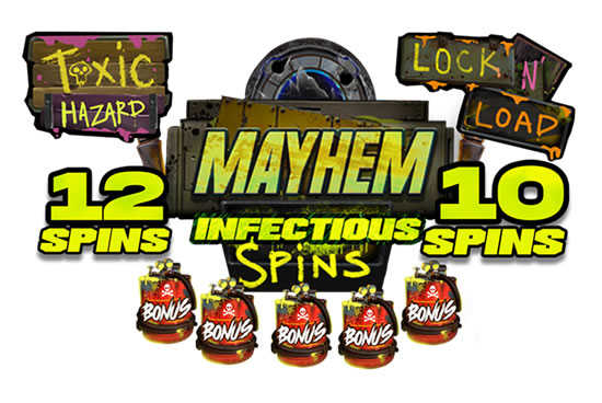 通常プレイ時にボーナスシンボルが5つ出現するか、フリースピン時にボーナスシンボルが5つ集まれば『Mayhem Mode』へと移行します。5つの高配当シンボルが黄金のInfectious5シンボルに変換されるのが特徴です。